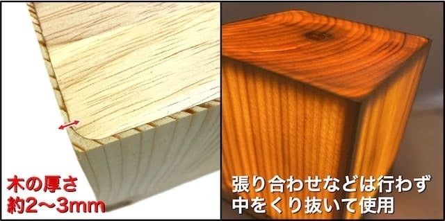 木目プリントや切断した木を貼り合わせたのではなく木の中身をくり抜いて使用しています。木目がくっきり浮き出るように木の厚さは約2〜3mmで製作。表面は無垢の状態で内側は強度を上げるためにコーティングなどを行なっております。