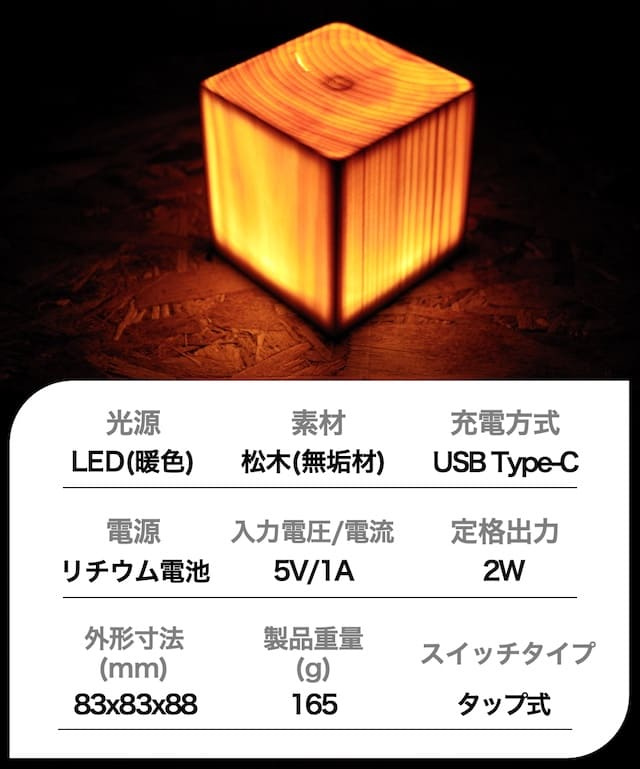 商品セット内容:木製ランプ本体、USB Type-Cケーブル、日本語説明書、専用箱