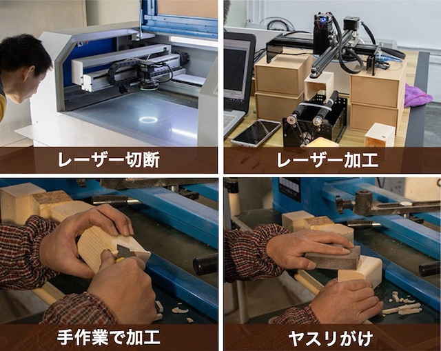 機械でレーザー切断や加工を行い仕上げに木のささくれなどで怪我をしないように一品一品手作業でヤスリがけなどの加工を行い綺麗に仕上げています。