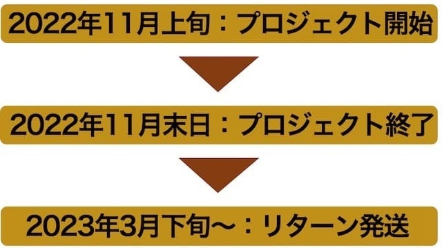 ※原則として配送遅延に伴うご支援のキャンセルはできませんが、リターン配送予定月から3ヵ月を超えた場合については、希望者に限りキャンセル対応をさせていただきます。