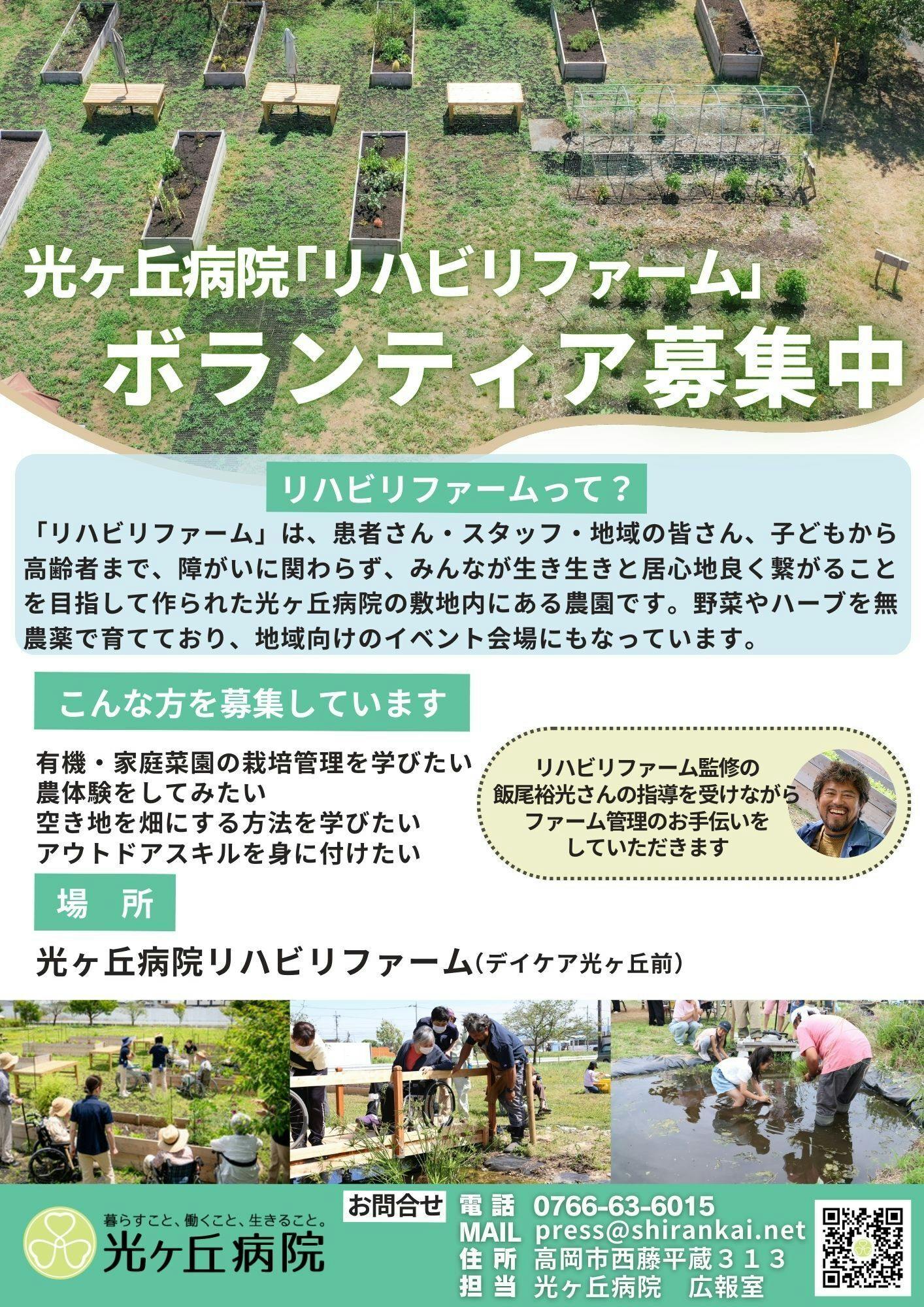 2024/08/09 06:00病院発・みんなの畑「リハビリファーム」では、現在ボランティアを募集しています。飯尾裕光さんの指導を受けながら、主にファームの管理のお手伝いをしていただきます。(日時・頻度などは相談となります)・家庭菜園の栽培方法を学びたい・農体験をしてみたい・空き地を農地にする方法を学びたい・アウトドアスキルを身に付けたい上記のような方など、農経験は全く問いません。リハビリファームのお手伝いにご興味が少しでもある方がいらっしゃいましたら、ぜひ、お気軽にご連絡ください。お待ちしています!電話:0766-63-6015メール:press@shirankai.net担当:光ヶ丘病院広報室※リハビリファームのコンセプトや内容については、リハビリファーム・ツアーの動画やHPでも紹介していますので、ぜひご覧ください もっと見る