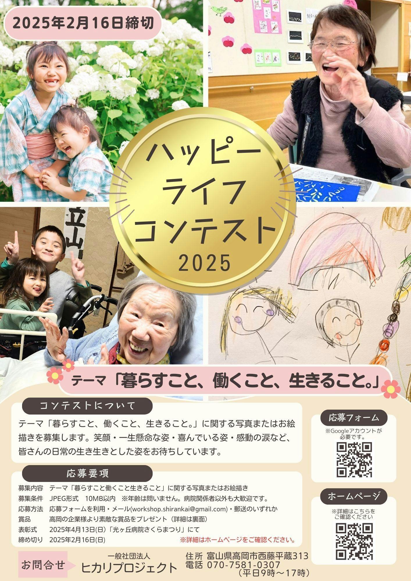 2025/02/05 17:00現在、恒例になりました、誰でも気軽に参加できるコンテスト、第4弾目の「ハッピーライフコンテスト」が開催中です。今年のテーマは「暮らすこと、働くこと、生きること。」皆さんの日常の生き生きとしたハッピーな姿のお写真やお絵描きをぜひご応募ください。(マスクなし推奨)今年は、20社のもの高岡の企業さんやお店から素敵なプレゼントをご協賛いただいております。ありがとうございます。また、4月13日(日)に行われる、光ヶ丘病院さくらまつり2025では、応募作品を展示し、表彰式も予定しております。ぜひ、みなさん、奮ってご応募ください。ご応募方法は以下の3択・グーグルフォーム(Googleのログイン必要)https://forms.gle/mhuZB1bTZTA2aHeQ7 ・メール shirankai.contest@gmail.com・郵送 〒933-0824 高岡市西藤平蔵313 締め切りは2月16日です。詳細はホームページをご覧くださいhttps://www.shirankai.net/archives/10282シェア大歓迎です。ご応募を心よりお待ちしております!2025年度も、さくらまつり・オープンファーム・自然を楽しむ畑の学校・収穫祭など、リハビリファームを利用して、子どもから高齢者まで皆さんが居心地良くつながる場所を目指して、楽しい企画が進行中です。お楽しみに! もっと見る