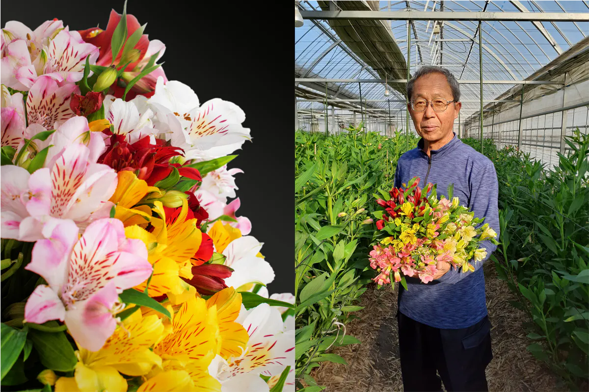 イエロー「持続」、ピンク「気配り」、白「凛々しさ」の花言葉を持つ3色のアルストロメリアで大きな花束を作り、武蔵野ルネさんのメッセージ付き直筆のサイン入り絵本をお届けします。