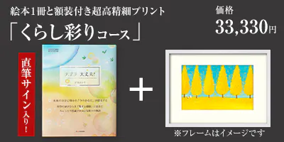 絵本『大丈夫 大丈夫!』にも掲載した原画をご希望のフレームに収めて、メッセージ付き直筆のサイン入り絵本とセットで、著者・武蔵野ルネさんが直接手渡しでお届けします。