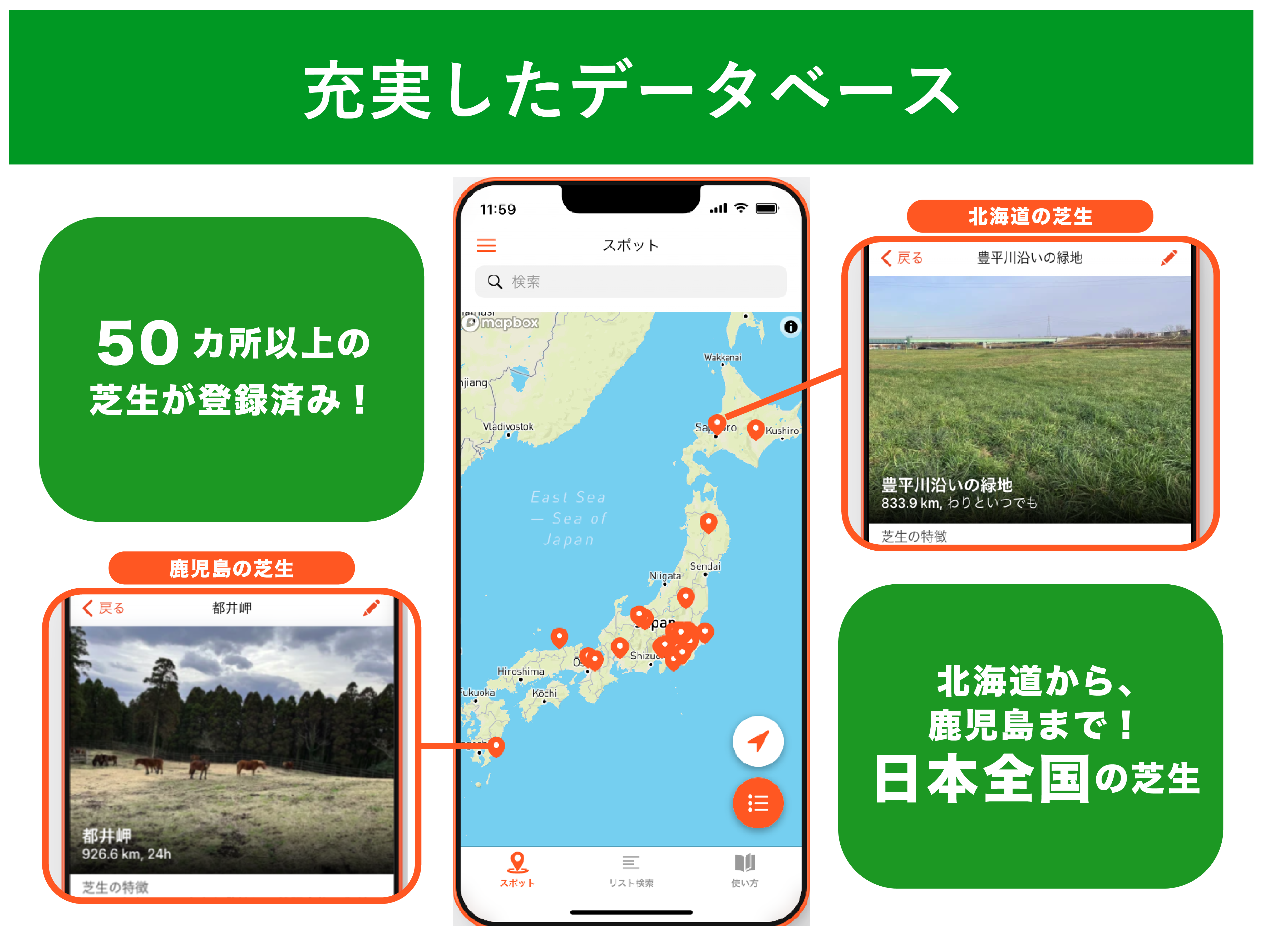 北は北海道、南は鹿児島の芝生までユーザのみなさんに登録していただいています!