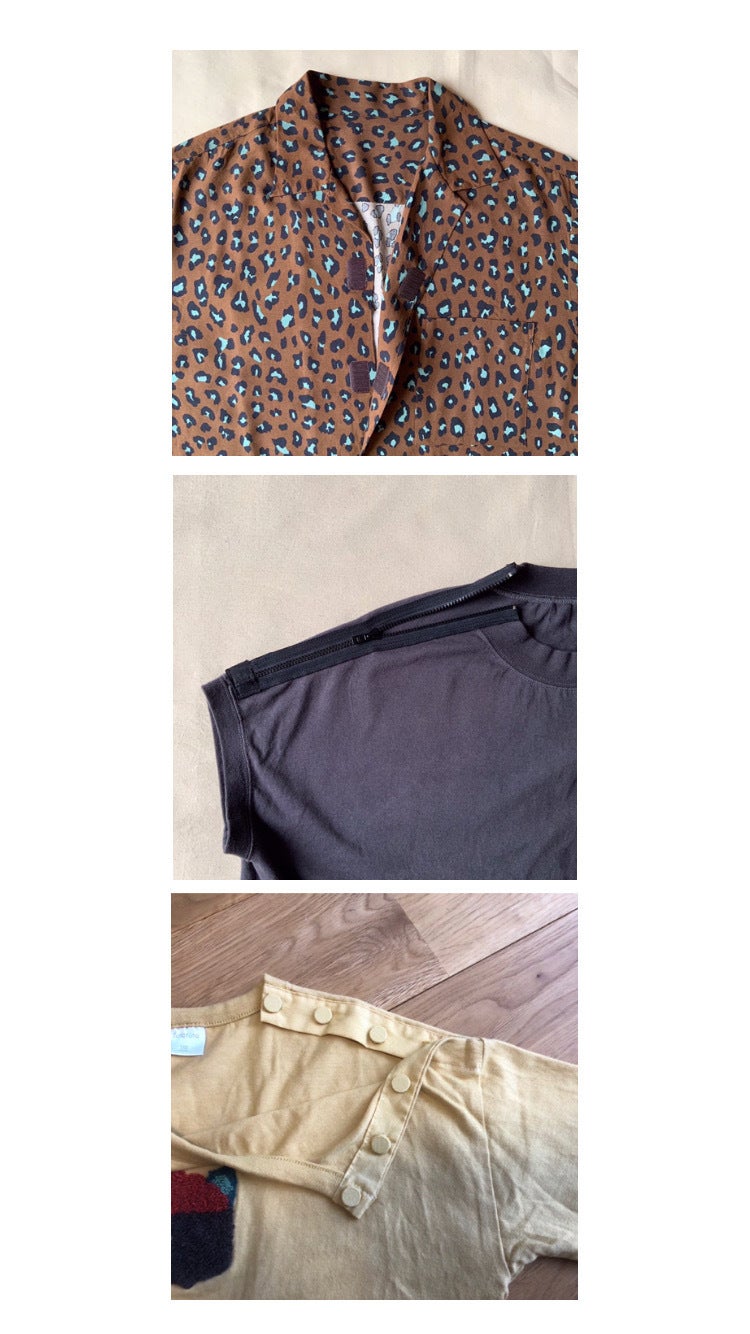 前開き、肩開きはマジックテープ、ファスナー、スナップボタン、磁石等を使用して着脱出来る様にします。