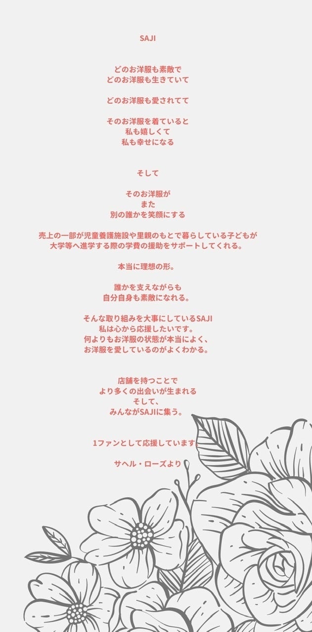 SAJIの古着を通して、いろんな方が「私に似合うかな?」とワクワクして古着を楽しんで貰えたら嬉しいです。