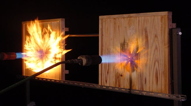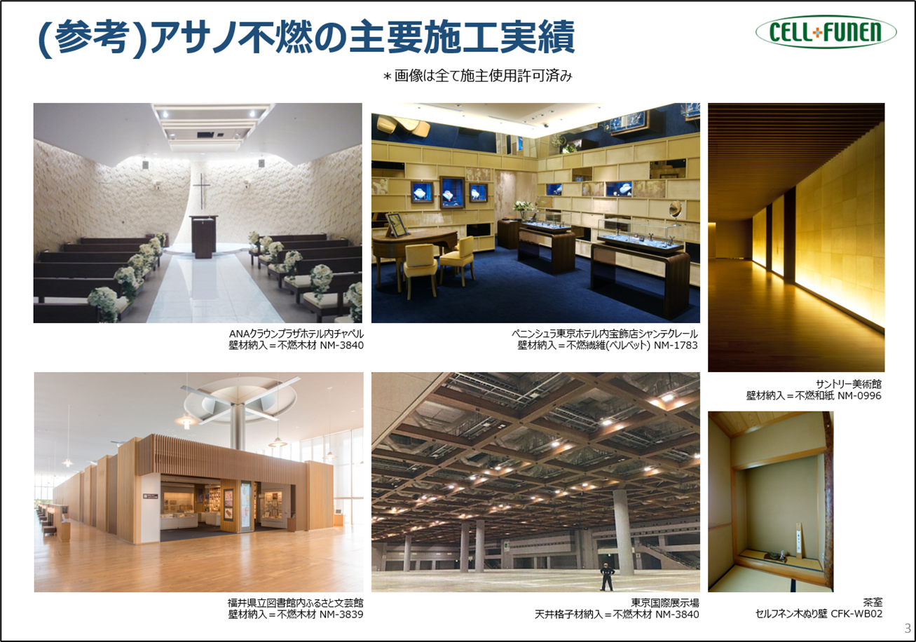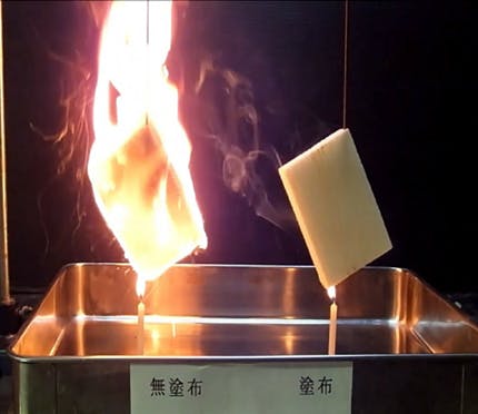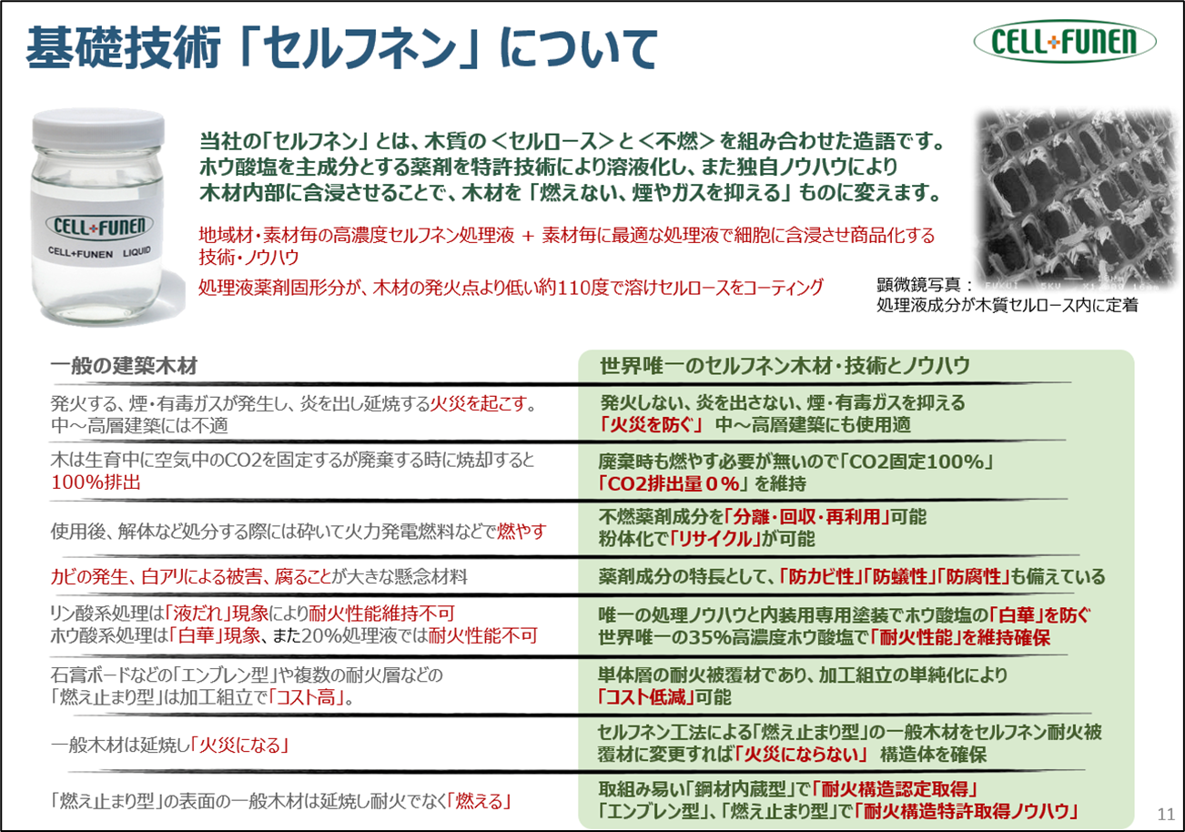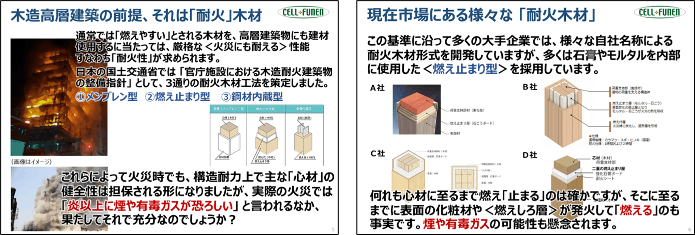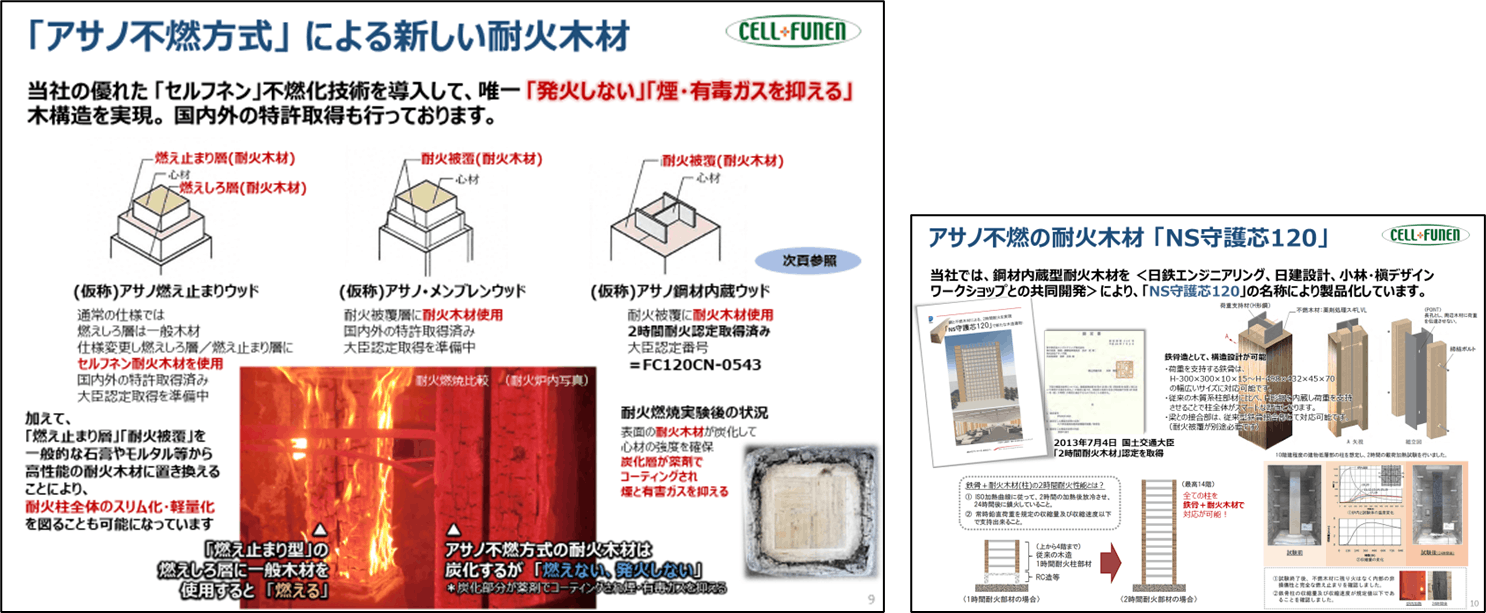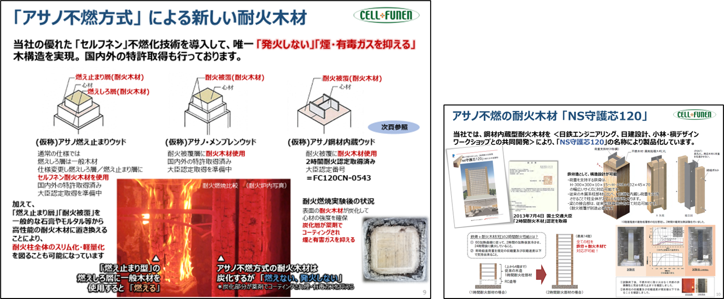 今回、燃焼実験を行う「不燃木材」もこの当社特許<発火せずに煙や有毒ガスを抑える>不燃化技術に基づいています。
