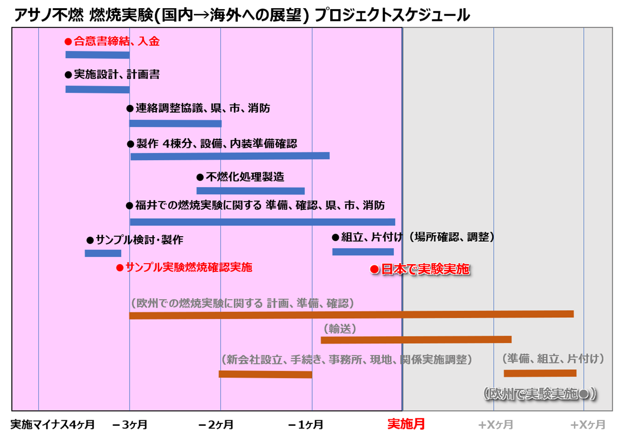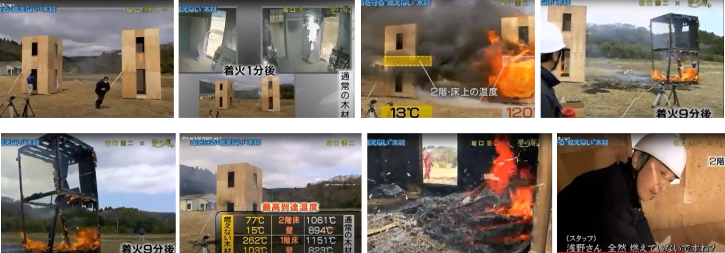 現在の「木造高層建築」の構造を模した、2階建ての「燃焼実験棟」を当社技術による<不燃化処理済み><不燃化処理無し>の材料による2棟をオープンスペースの会場に建築し、行政機関・消防関係・メディアなど関係者への公開のうえ両者を燃焼させ、その模様の比較により当社不燃化技術の有効性(着火せず煙や有毒ガスを出さない)を実証して発信。