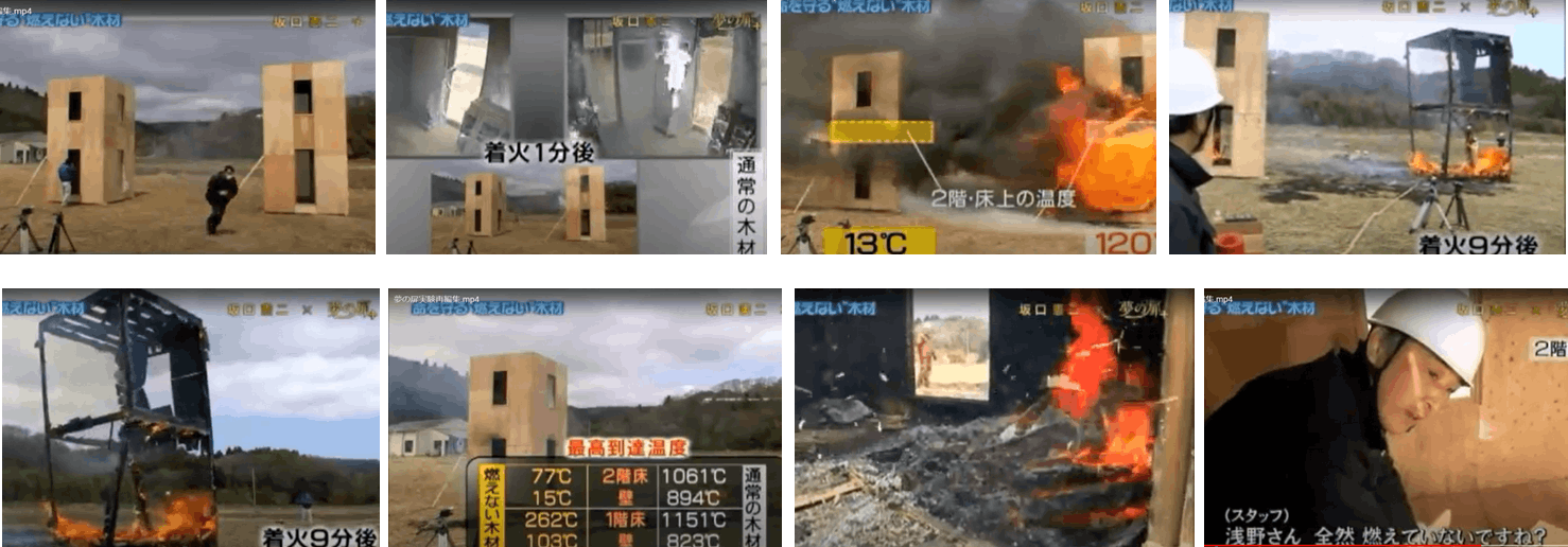 【火災にならない木造耐火建築物の燃焼比較実験】