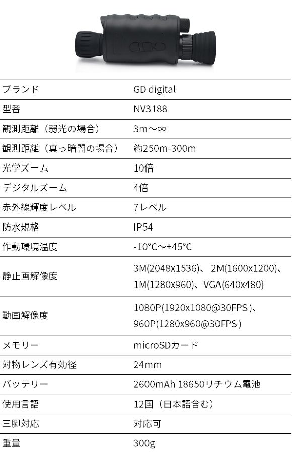 暗視スコープ「NV3188」は暗闇の中でも250〜300m先まで撮影・録画することが可能、赤外線で輝度を調整してハッキリ観察することも出来ます。3倍まで調節できるレンズがあり、近視・遠視の人でも使用できます!レンズは10倍光学拡大、4倍デジタルズームが出来ます。