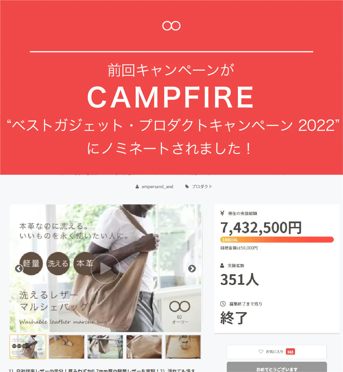 2022/12/23 12:00こんにちは、ampersandです。遂に、目標の3800%を達成することができました。毎日どんどん、ご支援頂き本当にありがとうございます。引き続きプロジェクトの拡散・シェアのご協力を何卒よろしくお願い致します。■【軽量×本革】ミニマリストの洗えるレザーマルシェバッグhttps://camp-fire.jp/projects/view/63519512月31日(土)23:59まで! もっと見る
