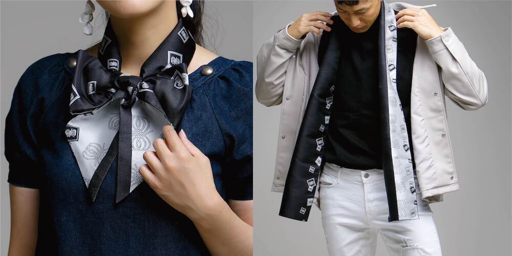 2021年に愛知県豊田市で育てられた春繭・秋繭を、緯糸(黒)に使用した、シックなモノトーン生地のコレクション。スカーフのような柔らかさ、ネクタイのような厚みとはりのある生地を目指し何度も試し織りをし、プリントではなく一本一本の糸が柄をなす織柄にもこだわりました。製織は長繊維のまち八王子市にて。