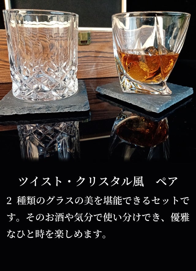 ツイスト型グラス×1、クリスタル型グラス×1、大理石コースター×2、ゴルフ型ガラス製アイスキューブ×2、大理石アイスキューブ×1、トング×1、ベルベット製専用バッグ×1、木製ケース×1