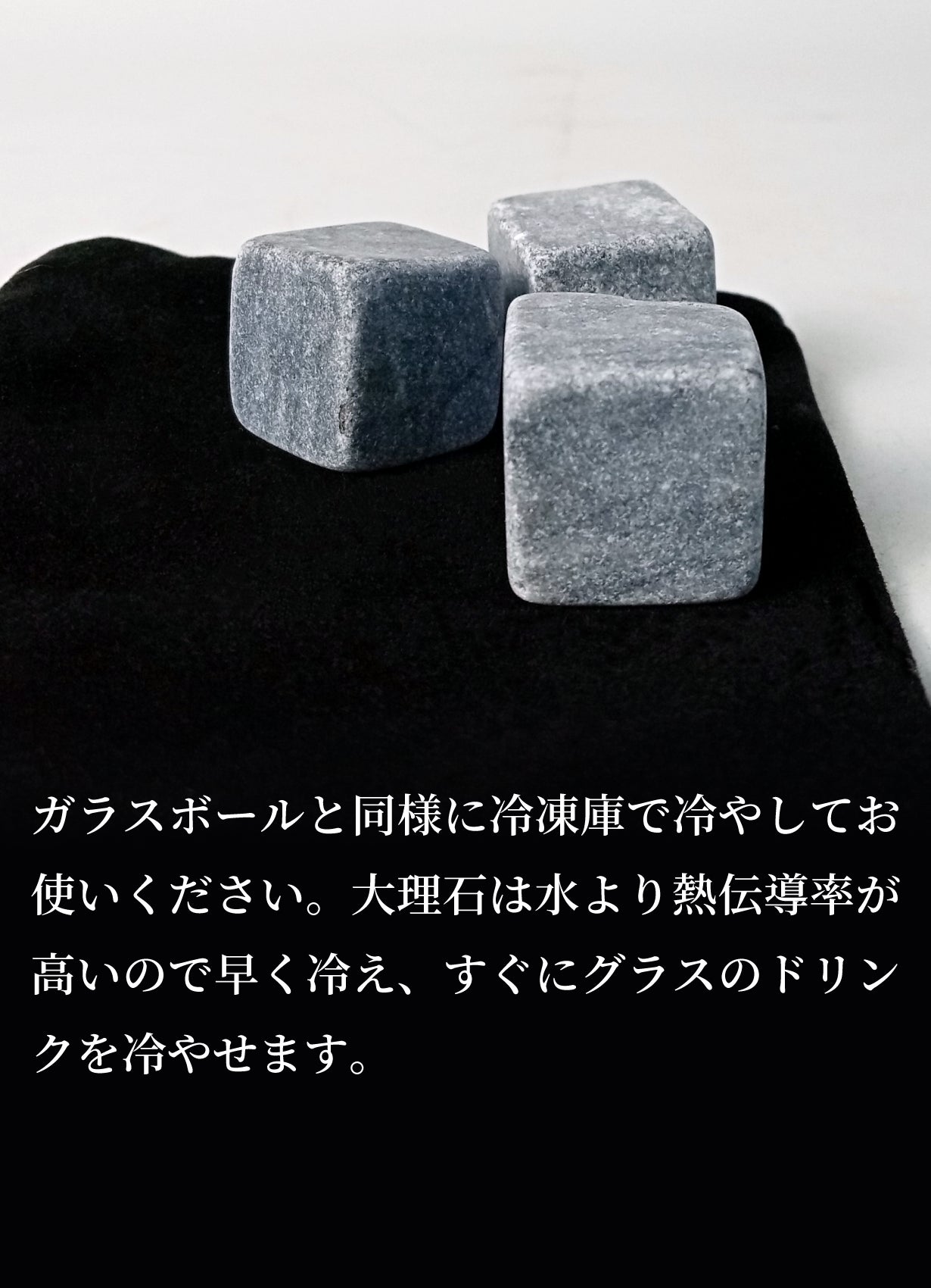 ストレートのお好きな方は、ゴルフボール型の小さなガラスボールや大理石のアイスキューブを付属しました。
