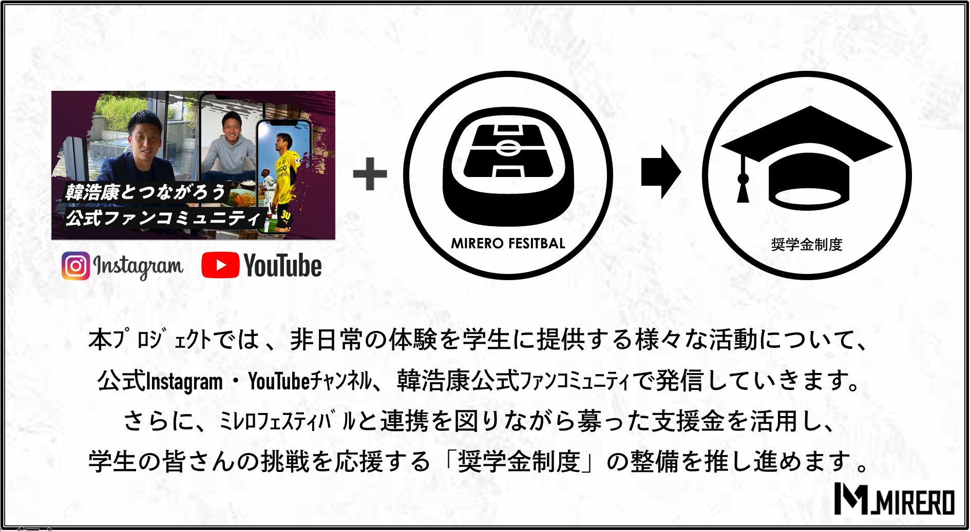 「ミレロフェスティバル活動資金」+「参加学生の通信制学校進学資金」に使用させて頂き、今後整備を推し進めていく「奨学金制度」に活用させて頂きます。