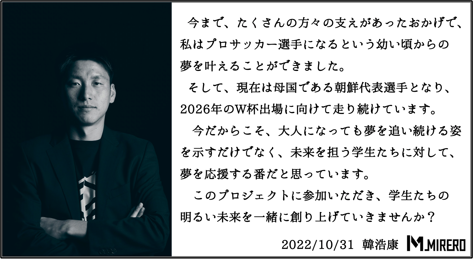 昨年12月、現役プロサッカー選手として活動しながら、母校の後輩にあたる朝鮮高校生卒業後のキャリア形成における支援の一環として、多くの方々に支えていただきながら『ミレロフェスティバル』を開催いたしました。