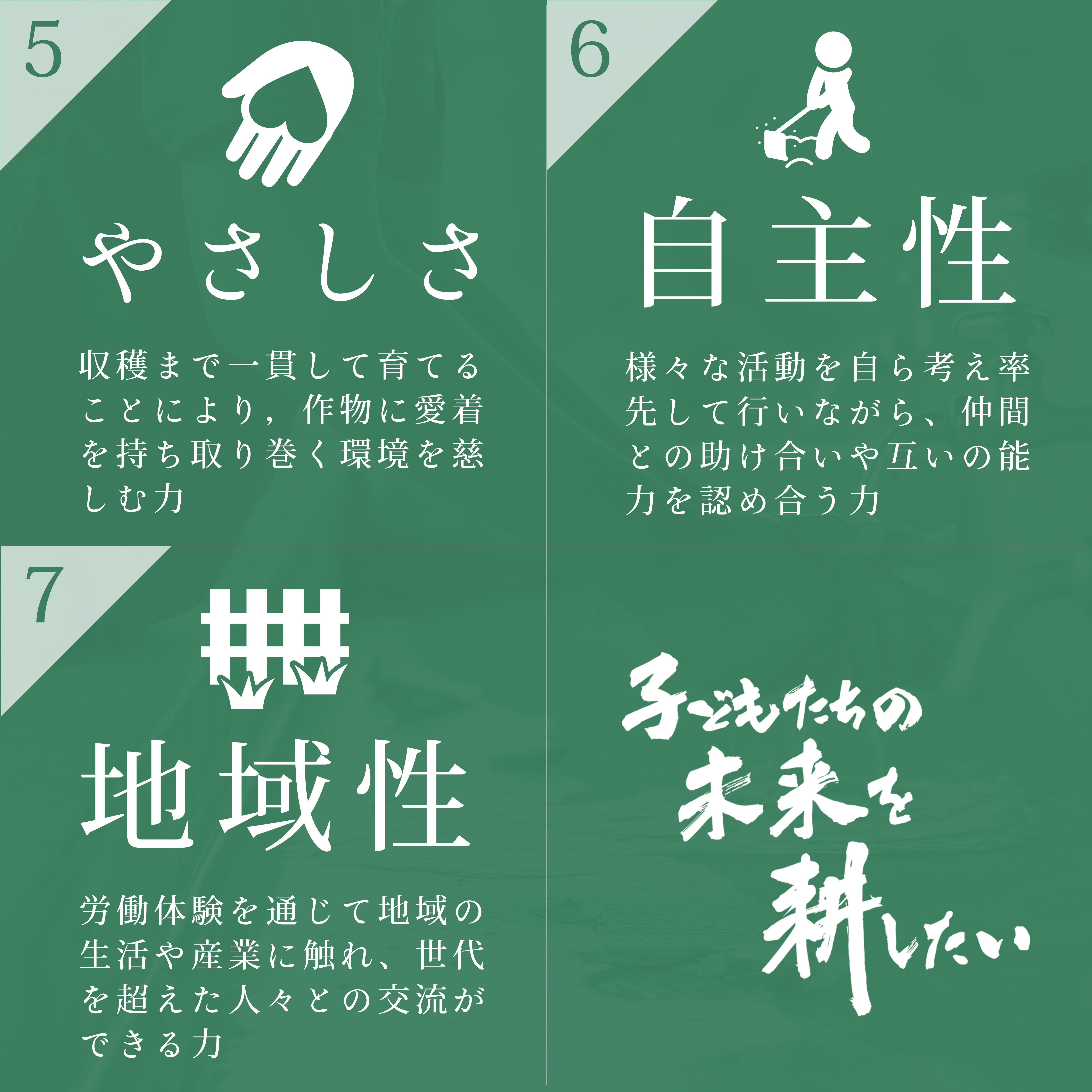 子ども達には、ここでの体験から新しい発見を積み重ね、生きる喜びから生きる力を蓄え、たくさんの楽しさを養分にして自立への道を歩んで欲しいと願っています。