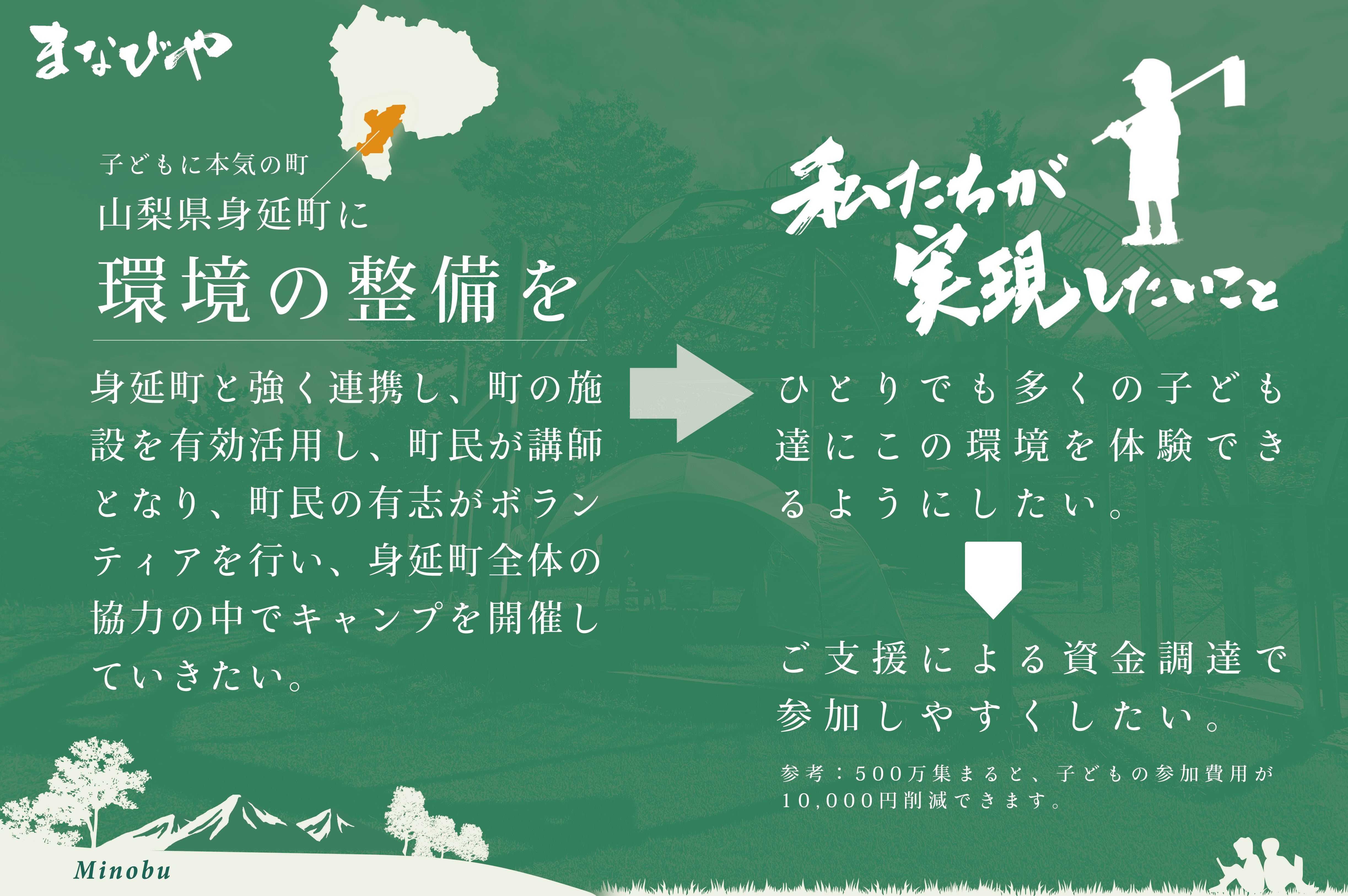 また、このプロジェクトの目的は、1人でも多くの子どもたちに、まなびやでの身体を使った体験を積み重ねてほしいと願うことから始まりました。一回でも多くキャンプを開催でき、子どもたちが体験をするたびに強くなって欲しいと思います。例えば500万円の支援金が集まりましたら、通常は25,000円の子どもたちの参加費が10,000円は削減できます。1,000万円集まりましたら、15,000円も削減でき、半額以下で参加できるようになるのです。
