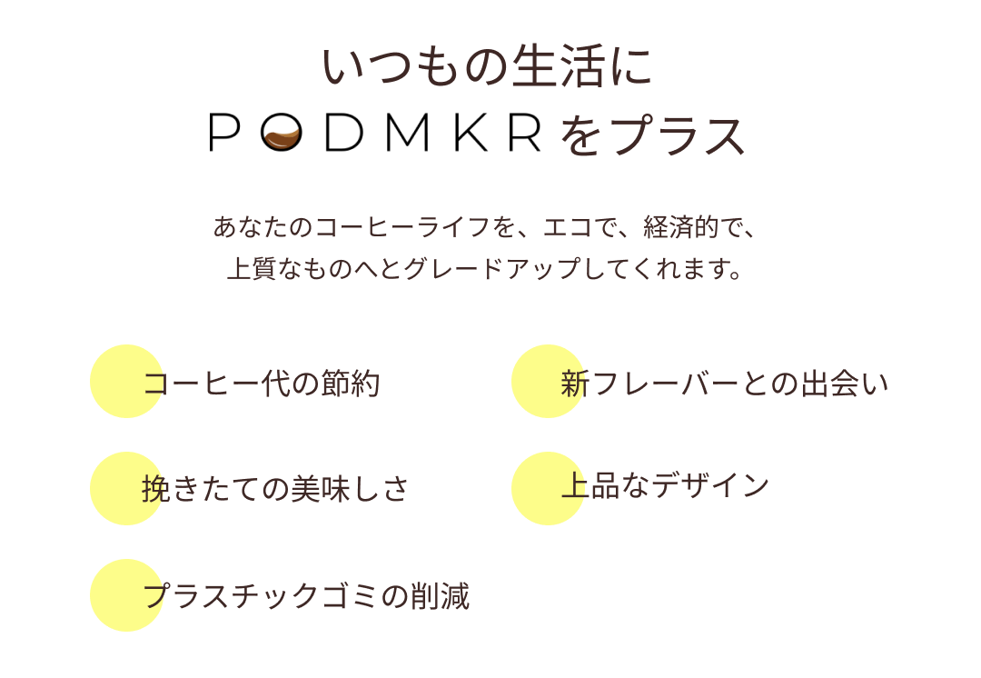 ※PODMKRは、Nespresso USA Inc.、Keurig、またはその関連会社が推奨、後援、ライセンス供与、または承認しているものではありません。NespressoはSociety des Produits Nestle S.A.の登録商標です。 Keurig®︎およびK-CUP®︎はKeurig Green Mountain, Inc.の登録商標です。BPI®︎は、それぞれの所有者の商標であり、それらライセンス利用基準に基づき使用されています。