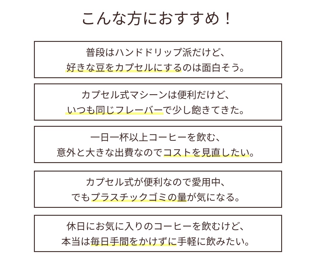 新しい香りや、ブレンド、グラインドレベルを自由に試して、自分だけのオリジナルコーヒーをこれまで通りのコーヒーマシンで楽しむことができます。