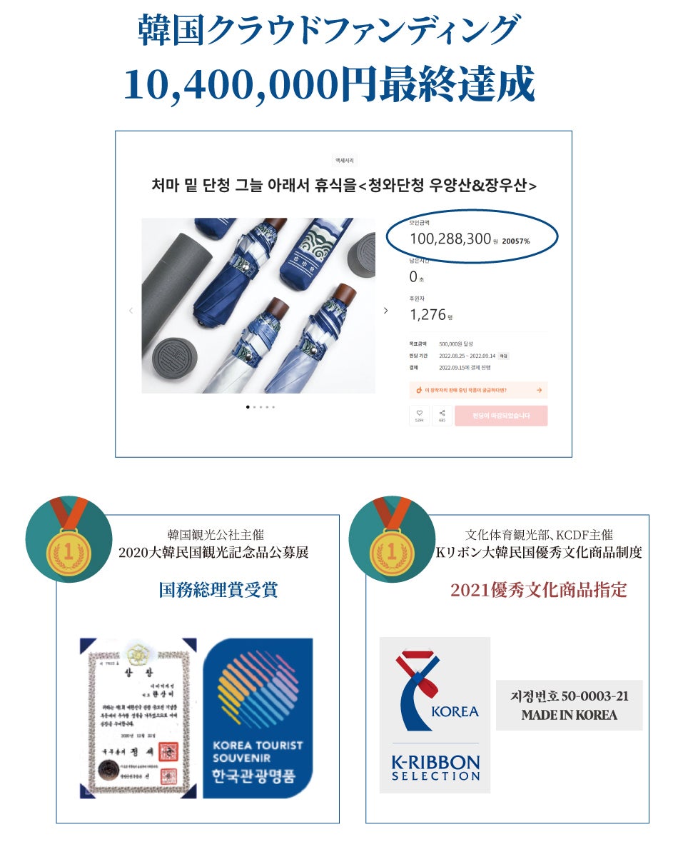 ミミダルブランドの「丹青傘」は韓国クラウドファンディングで1000万円を達成した人気製品で、国家公募展で「国務総理賞受賞」「大韓民国優秀文化商品」に選ばれるなど、優秀性が認められています。