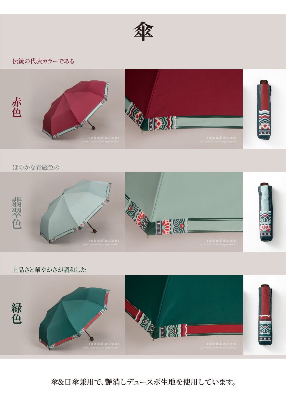 雨傘用途の製品が必要な場合は、雨傘専用に製作され、撥水力に優れた<赤色>/<翡翠>/<緑色>を選択してください。