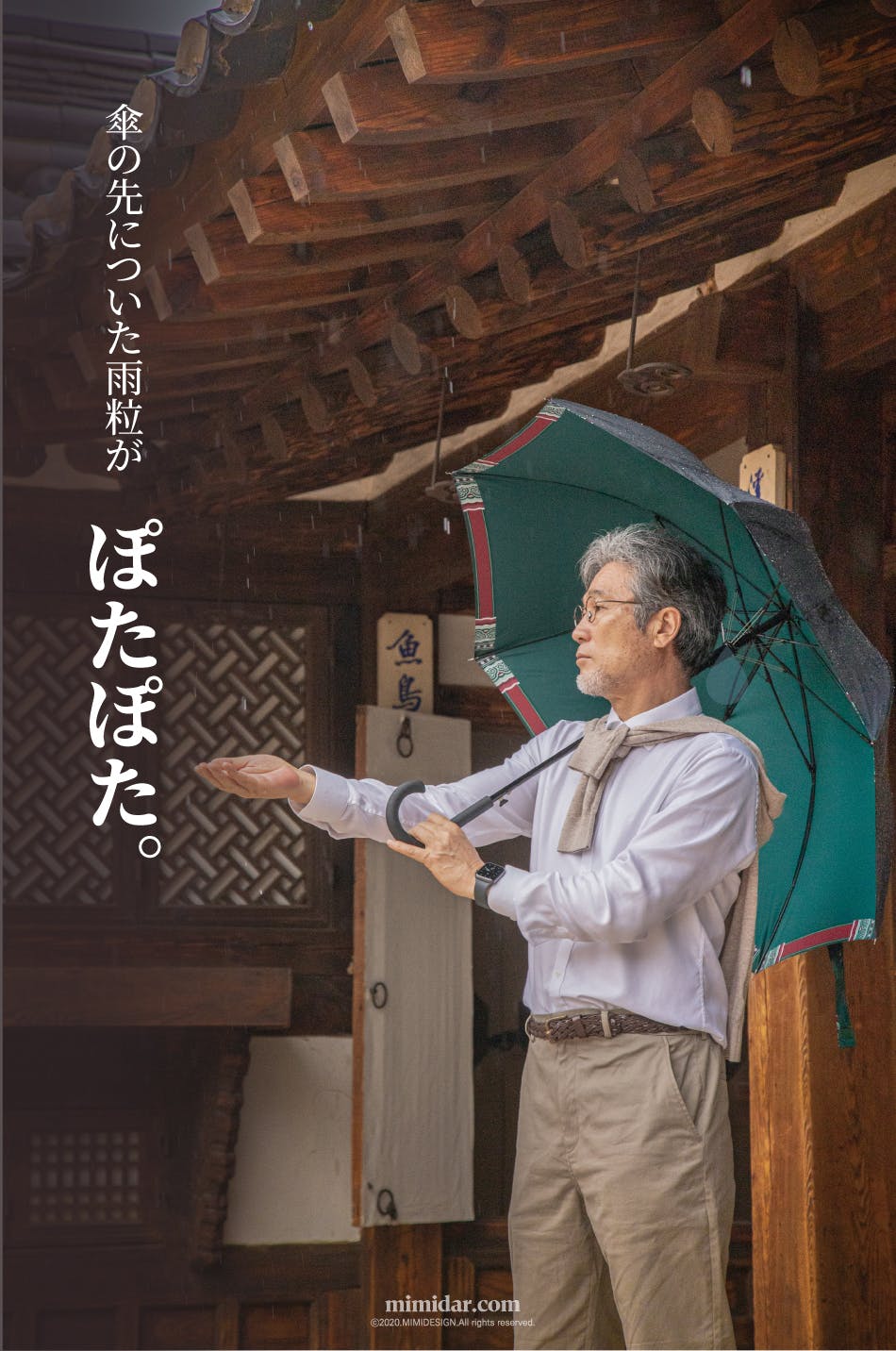 道を歩いている途中、突然降り注ぐ夕立に傘を差したら雨粒がぽたぽたと落ちた瞬間、傘の先に積もった雨粒は古宮の軒下から落ちてくる雨粒を見た光景に連れて行ってくれます。