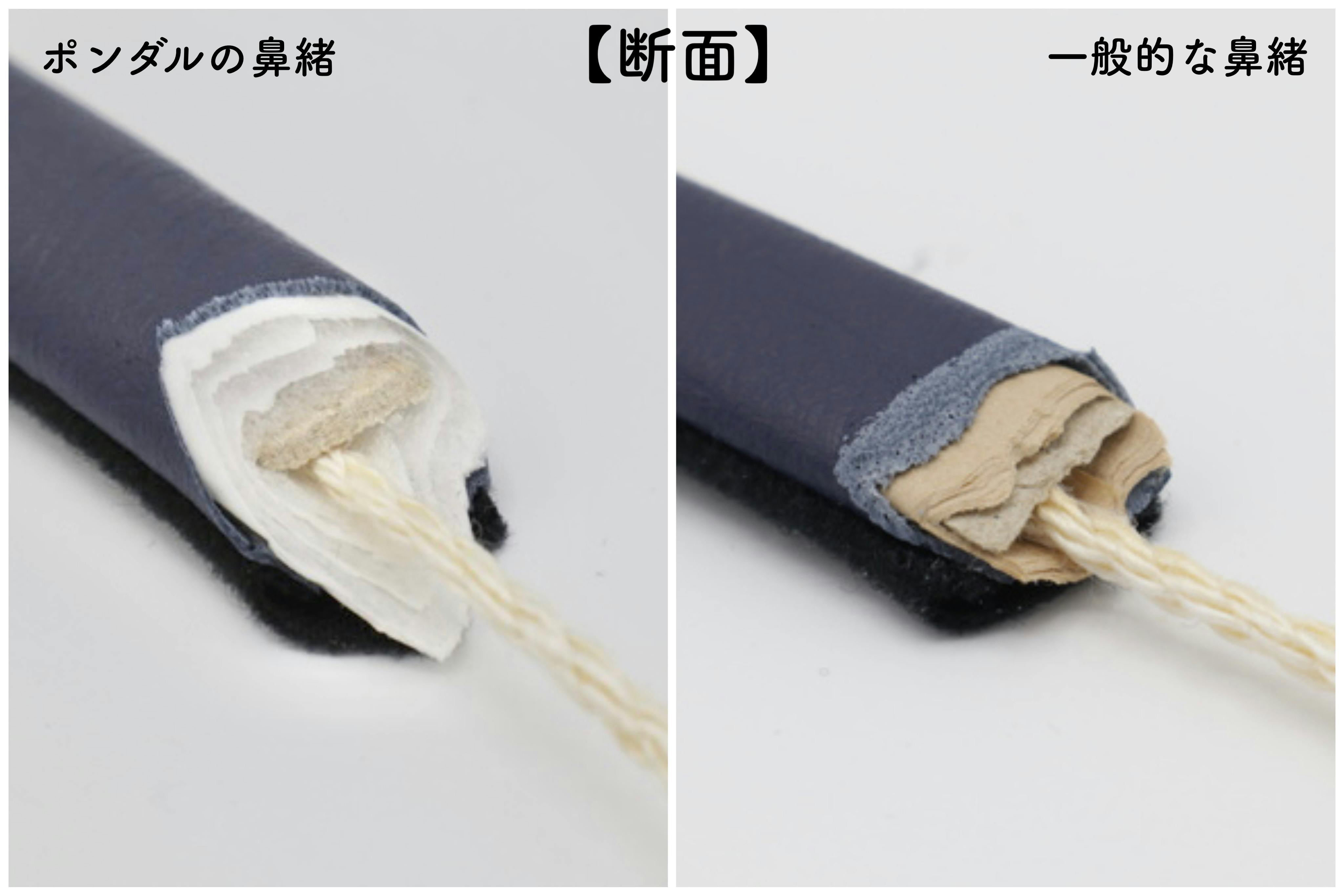 一般的な鼻緒は厚めの芯紙に茶色の薄紙を巻いて中に入れています。クッション性はほとんどなく、かなり硬い鼻緒です。鼻緒の痛みの原因の一つにこの芯材があります。