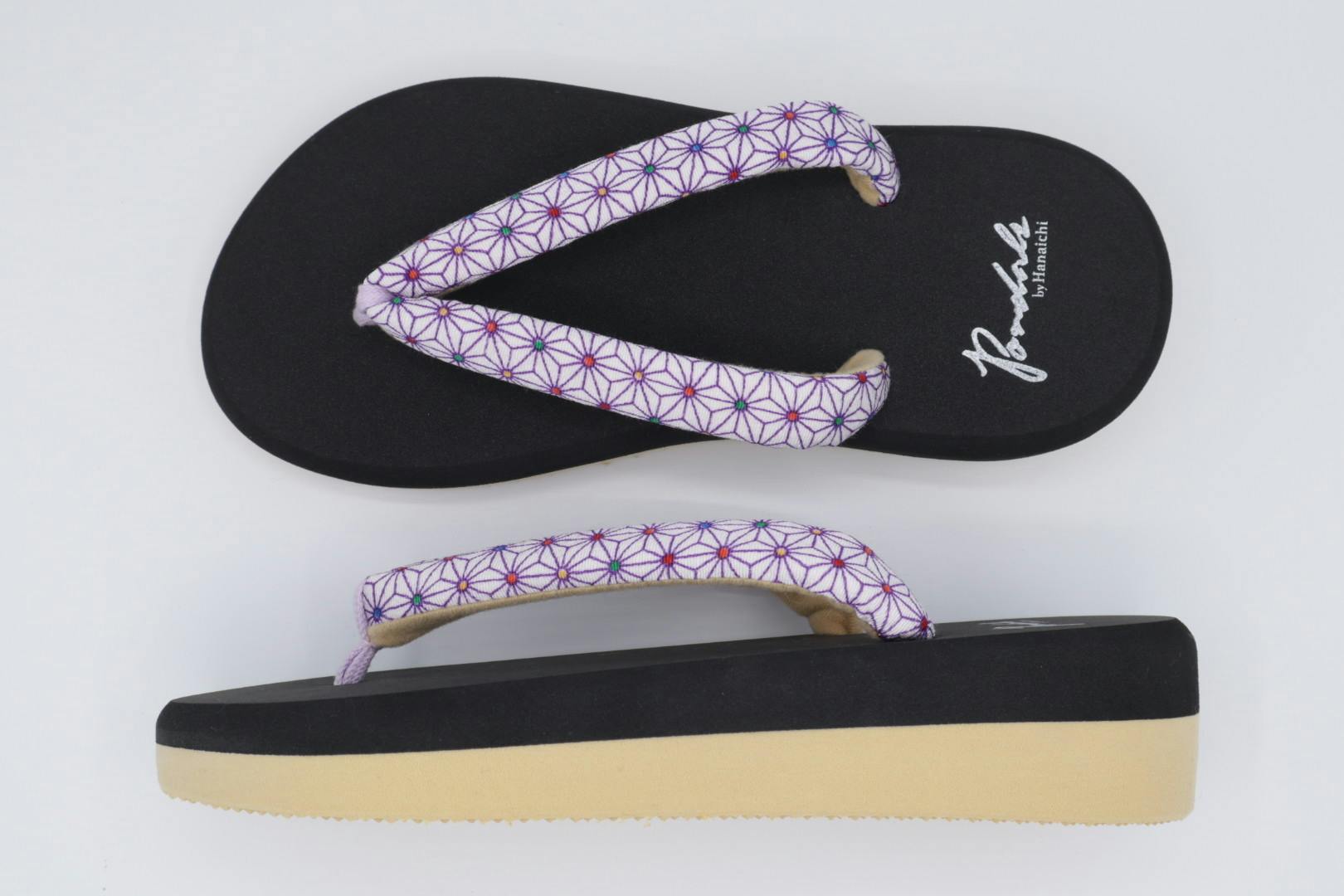 ポンダルは和装履物から派生した新感覚の履物です。今回、BOOSTERでお披露目する「ポンダル彩〜いろどり〜」には伝統的な和柄の一つである麻の葉柄を鼻緒に採用しました。麻の葉は成長が早く、真っ直ぐに伸びることから、麻の葉柄は古より子供の健やかなる成長を願う柄模様として広く親しまれてきました。最近では「鬼滅の刃」のヒロイン竈門禰豆子が着ている着物の模様としても有名ですよね。