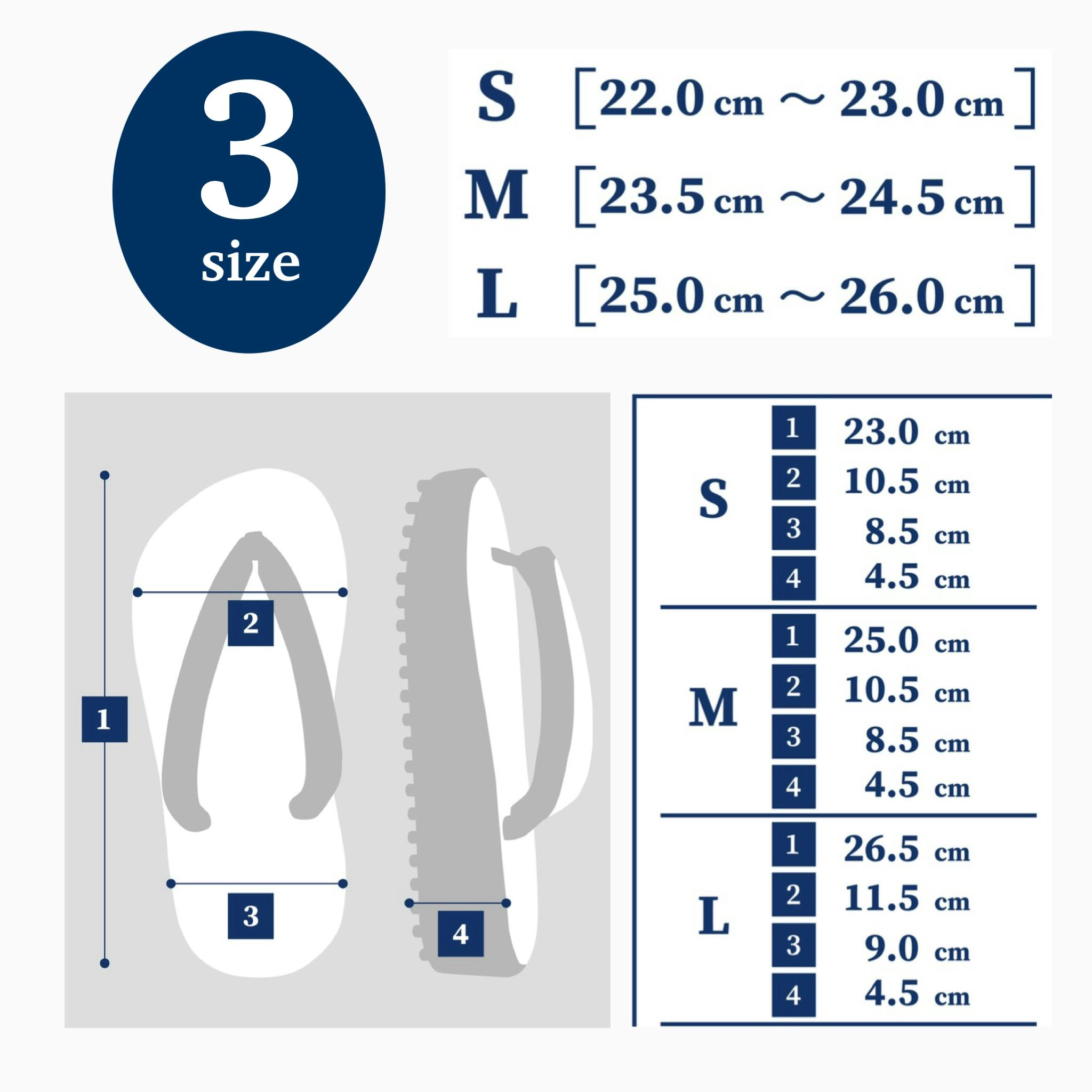 サイズは【S・M・L】の3サイズをご用意しました。和装履物は一般的に踵を1〜2㎝ほど出して履くのが粋とされていますが、ポンダルはサンダルと同じようにジャストサイズでお履きいただくことを推奨しています。もちろん和装履物のように踵を少し出して粋に履くこともできます。お客様のお好みの履き方でサイズを選んでみてください。