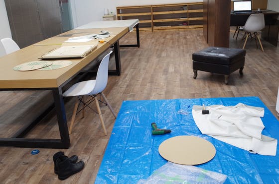 しかも横浜での展示で大型のインスタレーション* 作品を制作することになったため、さらにたくさんの刺繍糸が必要です。しかも、日本のほとんどのアーティストがそうであるように、シムラも現在狭いスペースで制作しているので大きな作品を作る場所がありません。
