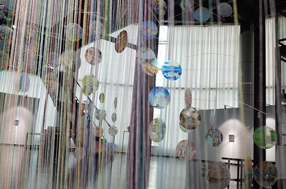 シルクの刺繍糸、透明フィルムを使用したモビールから成る作品。空気の対流により動くモビールにライトが当たる事により、フィルムに印刷された画像がランダムなアニメーションとして床や壁や糸に投影されます。