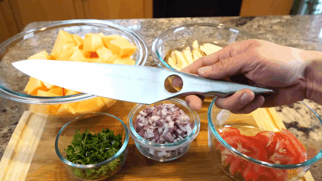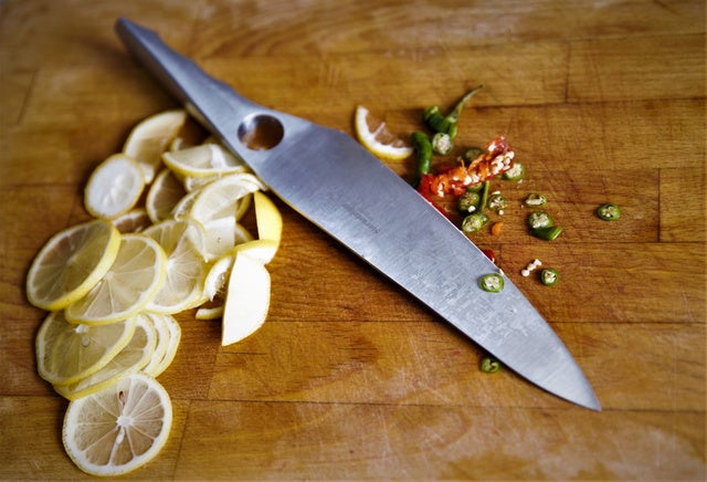包丁の中央に穴を開けることでグリップしたときにバランスをとりやすくしました。