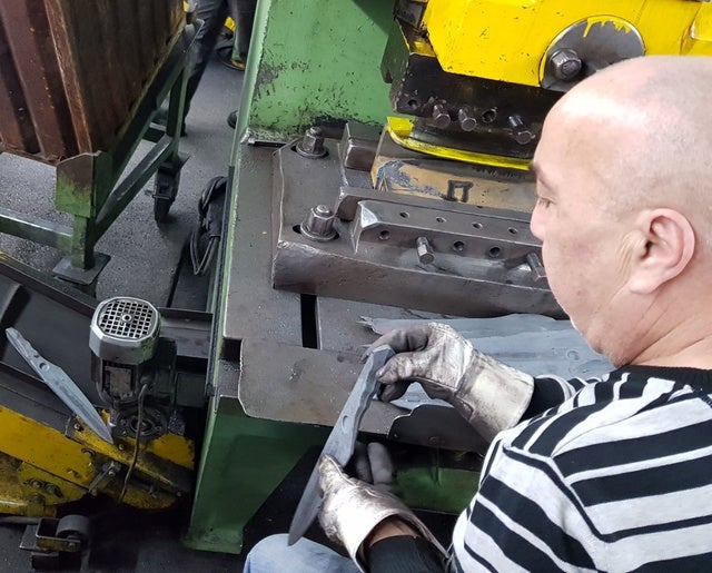 世界三大刃物産地と名高いドイツ・ゾーリンゲンの熟練職人がスティールのひとつの塊から包丁の形を成形し、14トンも圧力のかかるプレス機を使用します。