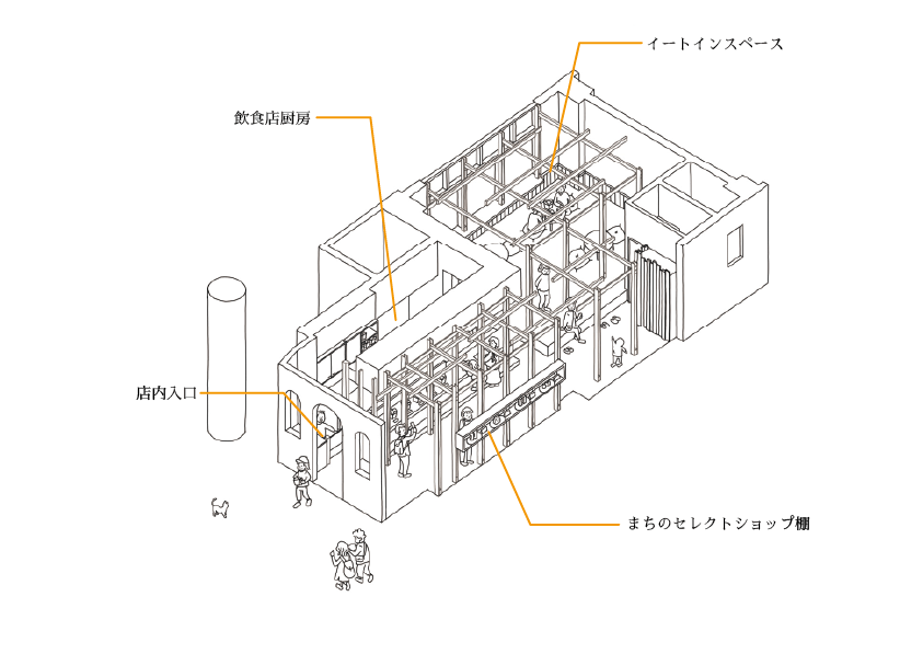 揚げ物が出来上がるまでの時間を、セレクトショップブースを見ることで解消する。あるいはセレクトショップで商品を見ている時間に揚げ物のいいにおいやイートインスペースでの楽しそうな雰囲気につられてしまう。そんな体験をぜひ完成後に堪能していただきたいです。