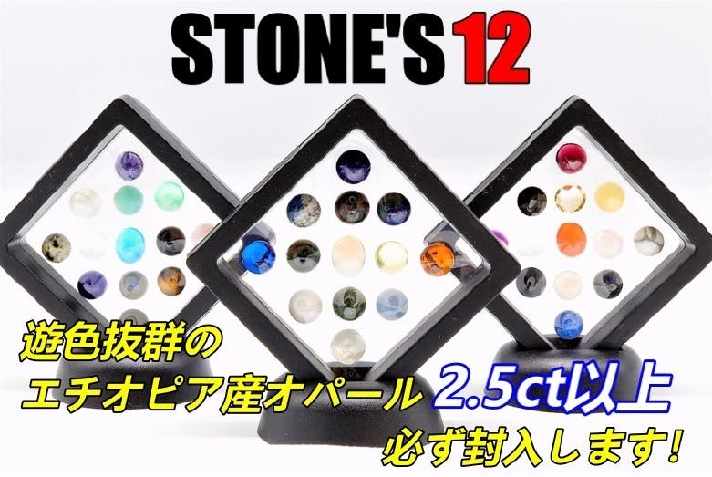 こちらの商品は、エチオピア産オパール2.5ct以上のルース1個(Color:White)+ランダムで選ばれた10mmの宝石ルース11個を詰め合わせた「STONE'S 12」です。