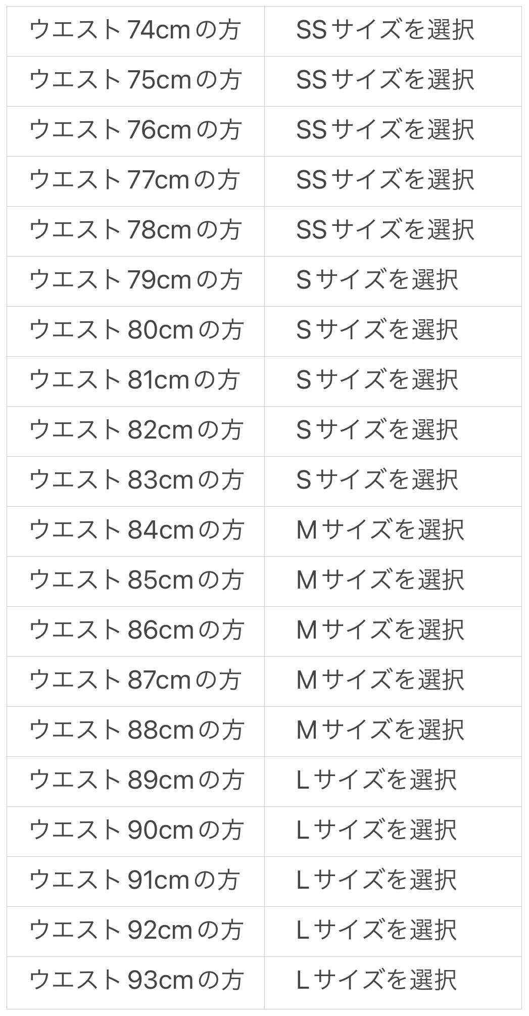大まかなウエストサイズ(cm)からの目安として、以下の通りご選択ください。