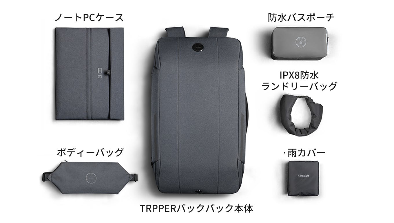<セットリターン>セットリターンはTRIPPER本体+雨カバーに加え、パッキングツール4点が付きます。合計6点の万能セットでどんなシーンにも対応!
