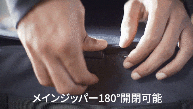 メイン収納のジッパーは180°全面開閉可能!立体的かつ丈夫な設計で、まるでキャリーケースのような安心感があります。底の方に入れたものを手探りで探したり、優先順位を考えながら収納場所に悩んだりすることはもうありません。
