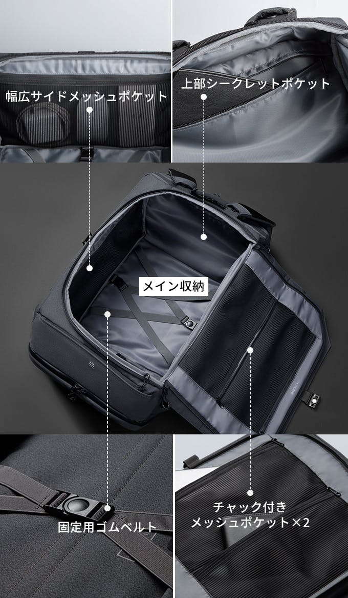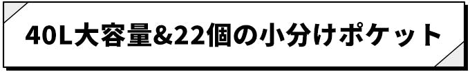 本体のポケットとオプションのパッキングツールを合わせて計22個の小分け収納で、あらゆる用途に対応!40Lの大容量でも乱雑にならず綺麗に整理整頓して収納できます。