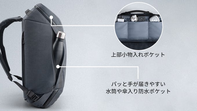 濡れた傘や、結露が気になる水筒の収納に困ることってありませんか?そんなお悩みにも、TRIPPERは解決策を用意!防水加工の施されたポケットを、手が届きやすいサイドに設置しました。上部には3つの小分けポケットもあるので、イヤホンや充電コードなどよく使うものはここにしまうのもおすすめです!
