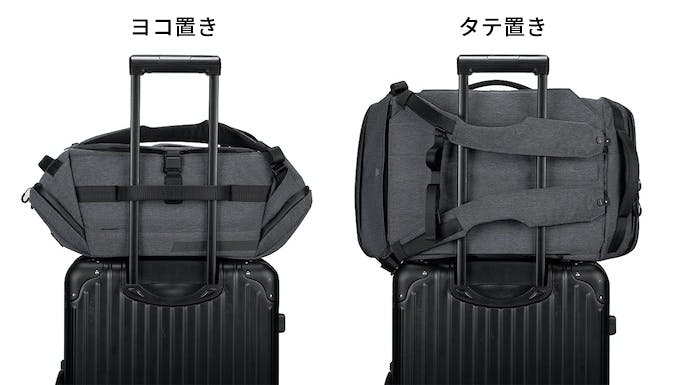 出張や旅行でキャリーと一緒に移動する時も、そのまま乗せるだけでOK!縦置きも横置きも、ベルトで固定すればさらに安定。