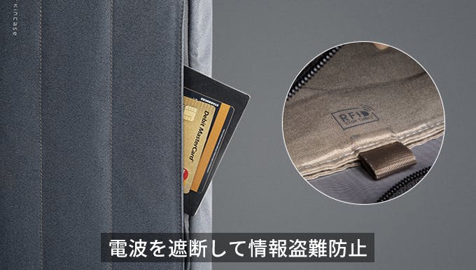 サイドポケットには、外部との通信を遮断する電波遮断RFIDポケットを設置。大事なクレジットカードやキャッシュカード情報の盗難防止はもちろん、スマホを入れてしまえば上司からの着信もシャットダウンできちゃいます。