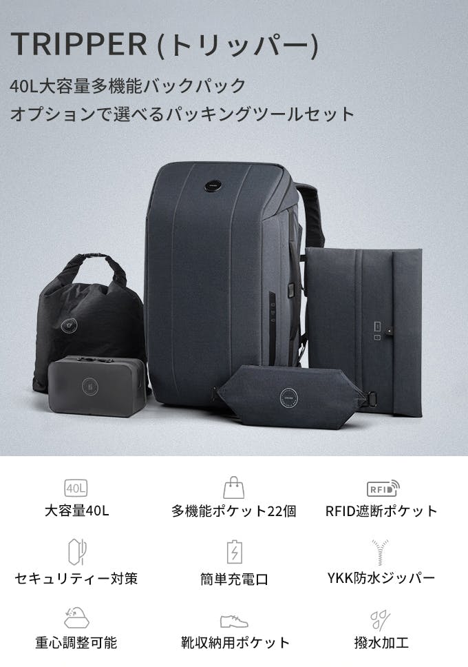 今回、セット購入として4つのこだわりパッキングツールを用意しました。あらゆるシーンでのTRIPPERの使用を想定した、高品質かつ多機能設計で、持っておけば間違いなしです!本体との統一感のあるデザインで、おしゃれかつミニマムに理想の旅を叶えます。