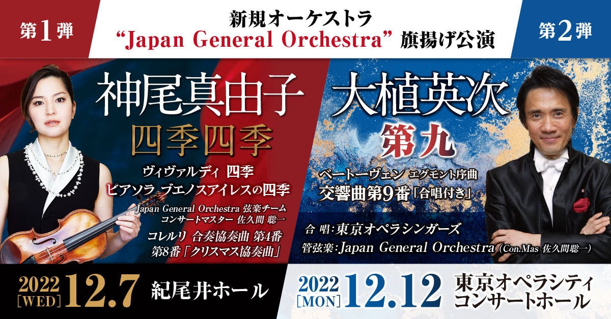 旗揚げ公演としては、大植英次の「第九」の他、世界的ヴァイオリニスト・神尾真由子と共に、2022年12月7日に紀尾井ホールにてヴィヴァルディの「四季」、ピアソラの「ブエノスアイレスの四季」を公演する。
