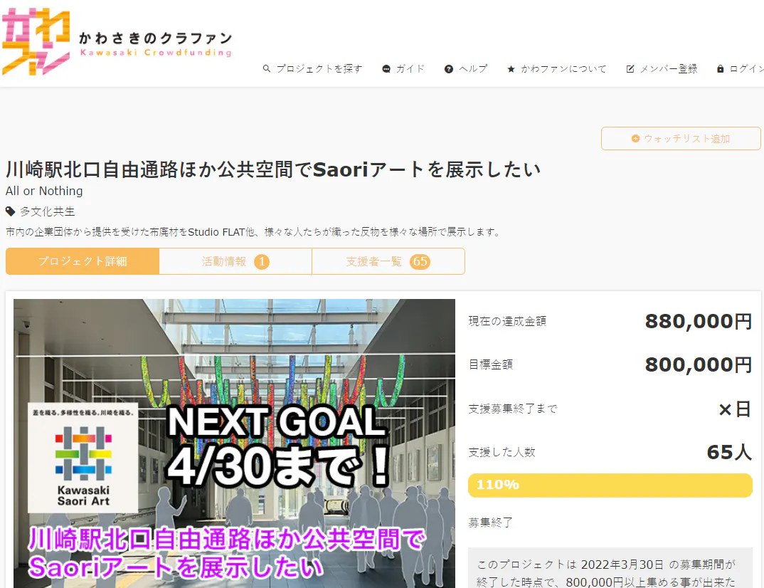 この展示を実行するにあたり、費用をかわファン(かわさきのクラウドファンディング型寄付プラットフォーム)で募ったところ、たくさんの応援をいただき目標額を超える88万円の費用を得て、無事展示を行うことができました。
