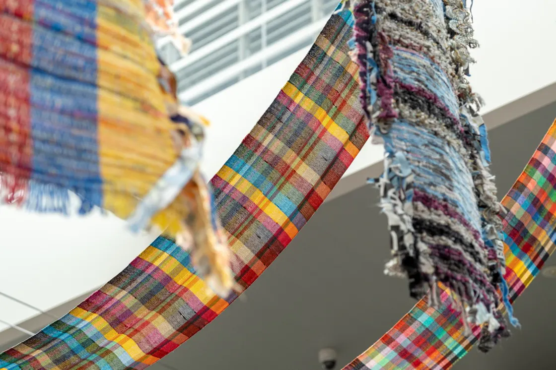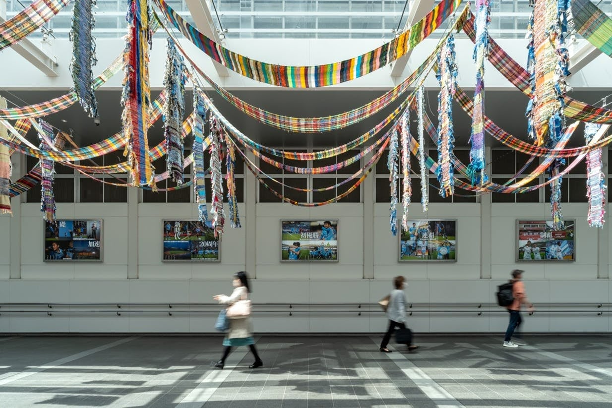 2022年3月に川崎駅北口自由通路の天井に全長約160mにもなる反物を空間展示する、「Saori VIEW in Kawasaki Sta.」を行いました。市民の協働による展示としては同所で初となり、川崎市の協力も受けて大々的に行うことで、さをり織りの魅力の認知を高めました。廃材を横糸として織り込んだ反物を連続させる展示はそのいろどりの美しさと迫力で話題を呼びました。