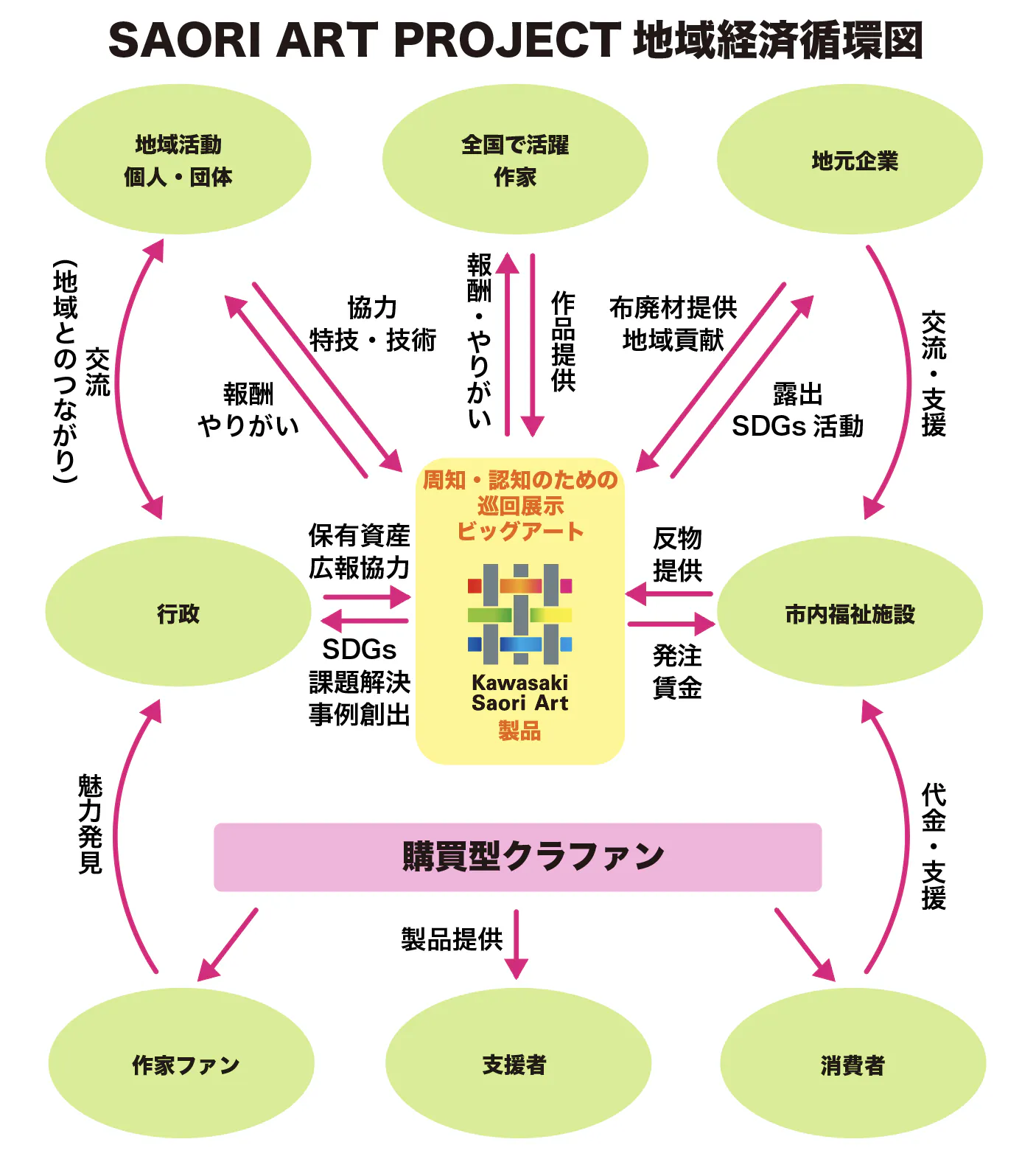 今回、さをり織を使った商品が購買型クラウドファンディングを通して、一人でも多くの皆さんからご支援していただくことで①廃材収集(企業)②布の裁断作業(市民)③さをり織り作業(アーティスト)④商品化(支援者)の経済循環が成り立つことをゴールに掲げています。