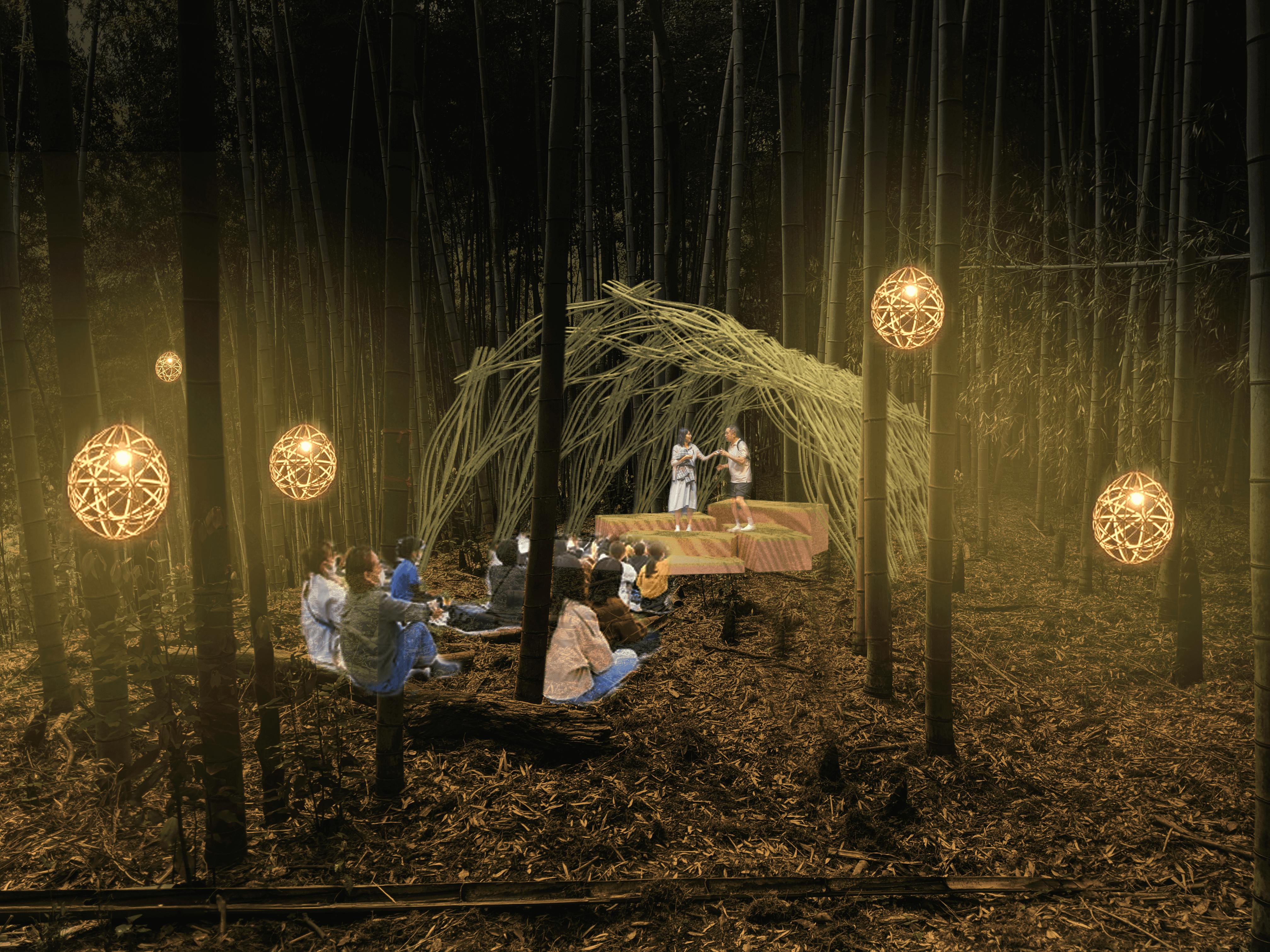 (原) 竹の素材としてのポテンシャルに向き合い、竹林の空間の魅力を最大限に引き出すことを目指して、ステージの設計に取り組みました。学部時代からの研究テーマとして取り組んできた竹建築の研究の集大成となっています。竹林の中に建つ竹のステージとそこで行われる演劇作品を是非お楽しみください!
